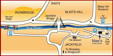 From Ironbridge follow Waterloo Street along the riverbank and cross the "free bridge", turn left into Coalford, following the brown tourism signs for the Maws Craft Centre and leading into Calcutts Road. Turn immediately left onto Salthouse Road, go past Jackfield Tile Museum on your right and continue along this road, past the Half Moon Inn on your left towards the Maws Craft Centre which will be the next building after the Half Moon on your left hand side.